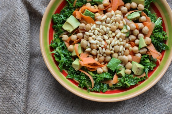 First things first, you need to prepare the kale. Wash, dry and remove any big stalks, before tearing it up into small bits (this will help it marinate better). Put into a big bowl and add the salt, cumin and sesame oil, massaging it into the kale for a couple of minutes. Then, add in the carrots, avocado and chickpeas and sprinkle the pine nuts on the top.