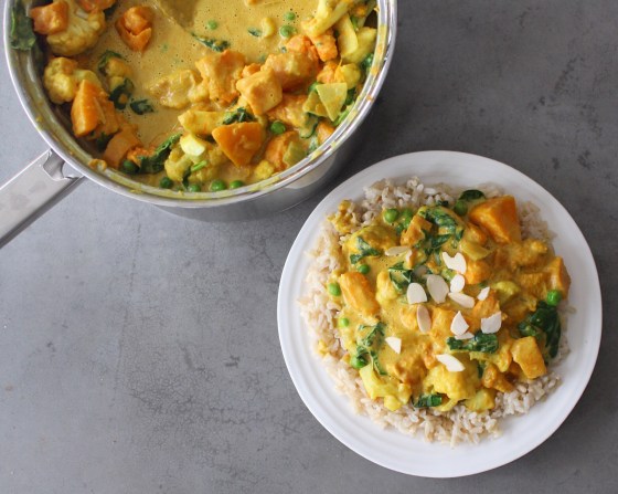 Add the softened sweet potatoes and butternut squash to the saucepan, throw in the curry sauce too and then chuck in the peas and spinach. Keep stirring every 2 – 3 minutes, tasting and seasoning to your heart’s content. Then put the lid on the saucepan and leave to cook on a low heat for another 10 minutes. Eat it up with some brown or cauliflower rice!
