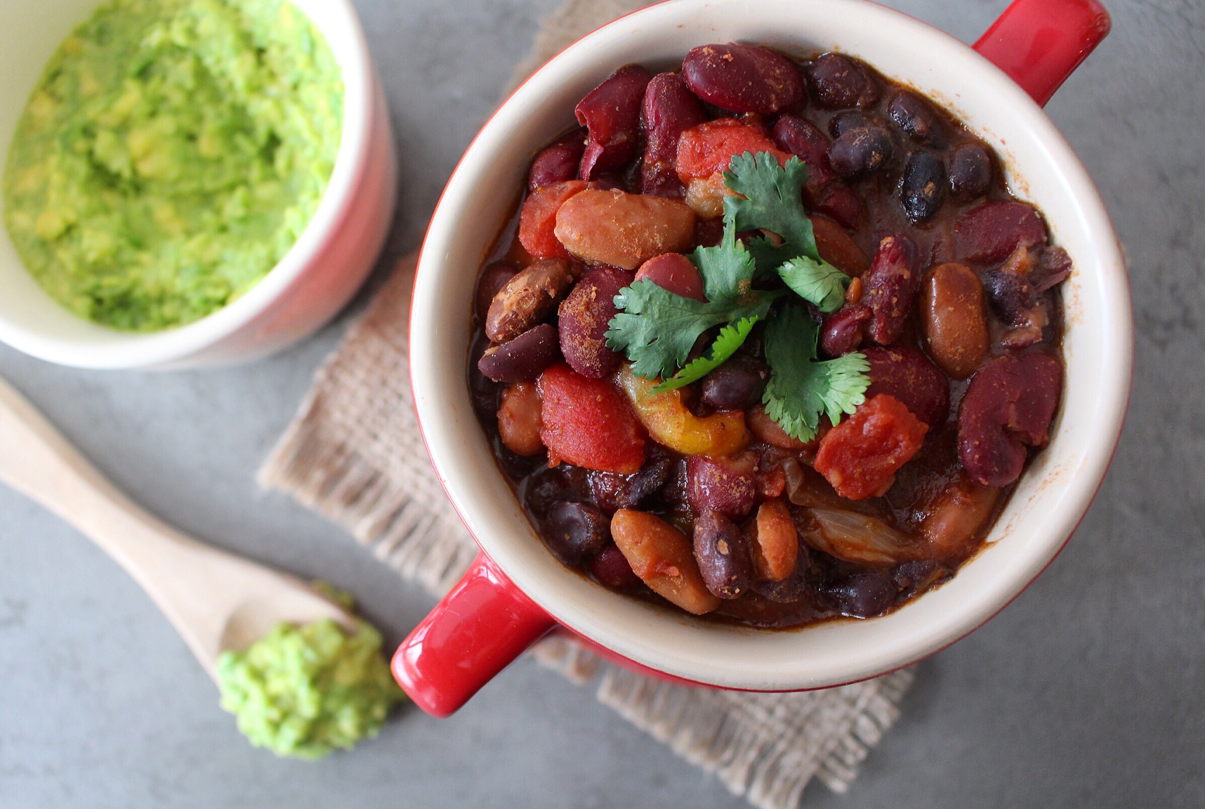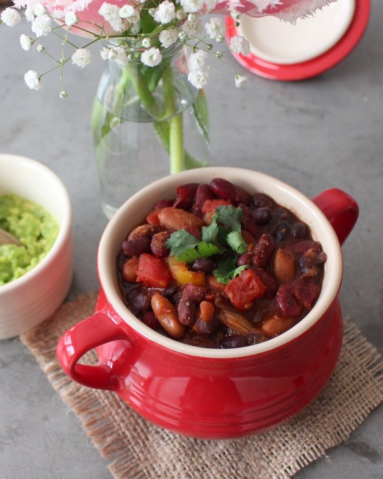 So now for the easy bit. Fling all the ingredients into your slow cooker, give them a good stir and cook on a high setting for around 6 hours, or until it starts to thicken up. Serve with tortilla chips or brown rice and a generous dollop of guacamole – perfection!