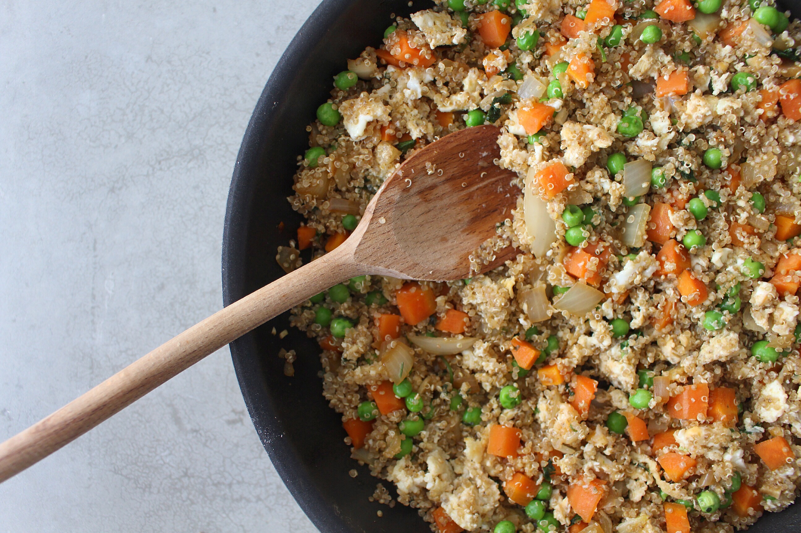 Fry on a medium heat for a couple of minutes, then add in the peas and the quinoa. Once this is all mixed in, make a space in the middle and crack in the eggs – leaving them to fry for a couple of minutes before chopping them up with your wooden spoon and then mixing in with the other ingredients.