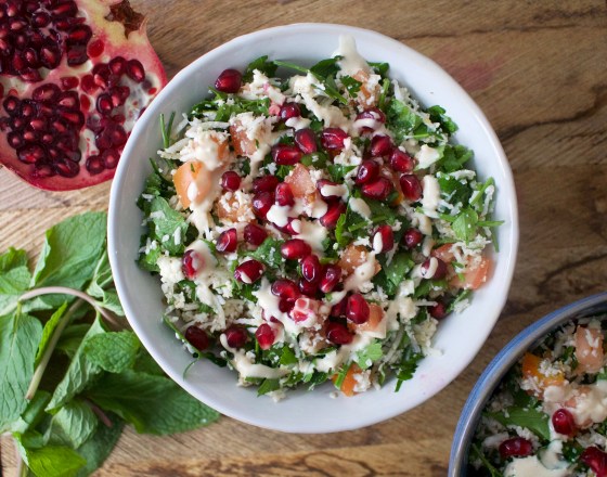 Finely chop the tomatoes, parsley and mint and combine with the cauliflower in a large bowl. Add the remaining ingredients and stir until all mixed together. Spoon into bowls (garnish with parsley, mint, tahini or pomegranate if you like) and enjoy!