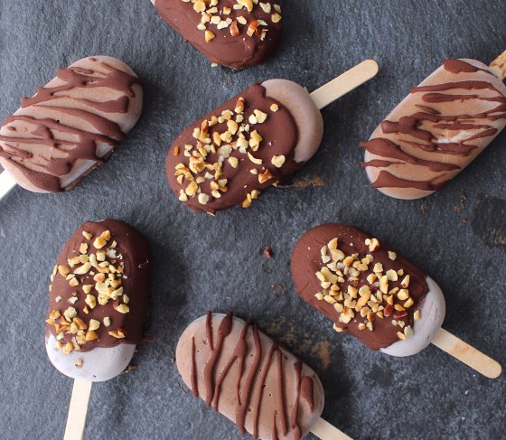 In a food processor, blend the ice cream ingredients together until mixed. Pour into ice cream moulds and leave for a few hours to set.