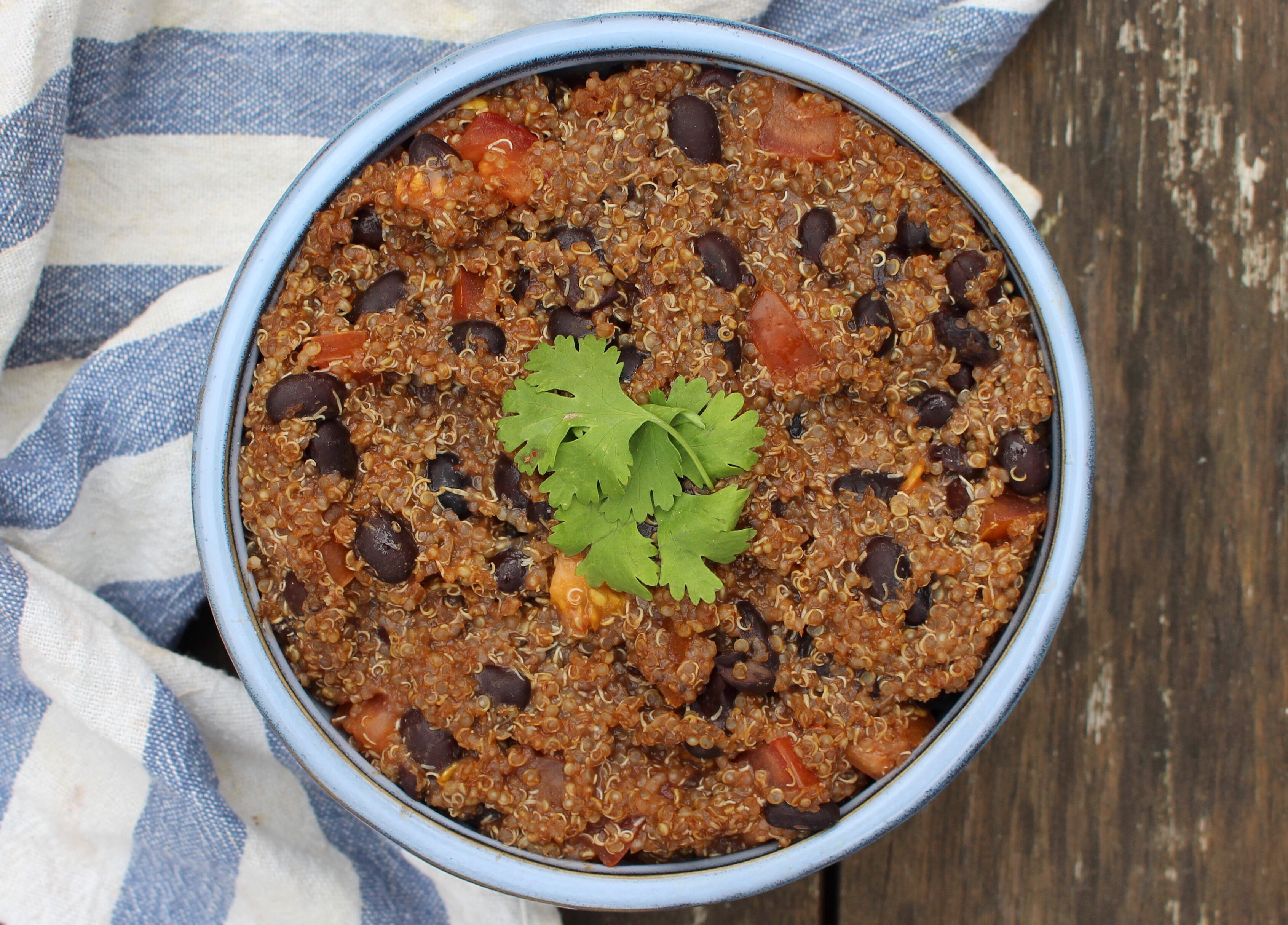 First, boil the quinoa in a saucepan for ten minutes. While this is cooking away, finely chop the tomato and onion, and in a bowl mix together the olive oil, salt, lime juice, chipotle, cumin, cinnamon and cacao. Pour this mixture into a frying pan, adding in the onion, black beans and chopped tomato as well, and fry gently for a couple of minutes.