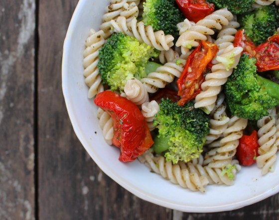 Bring a saucepan full of water to the boil and pop in the pasta. While it’s cooking, put the pine nuts, basil, olive oil and salt in a food processor and whizz for about a minute until they form a delicious pesto. When the pasta is almost done, bring another saucepan of water to the boil and add in the broccoli. Once the broccoli and pasta are cooked, drain them and pour them both into a big bowl, stirring in the sun-dried tomatoes and pesto.