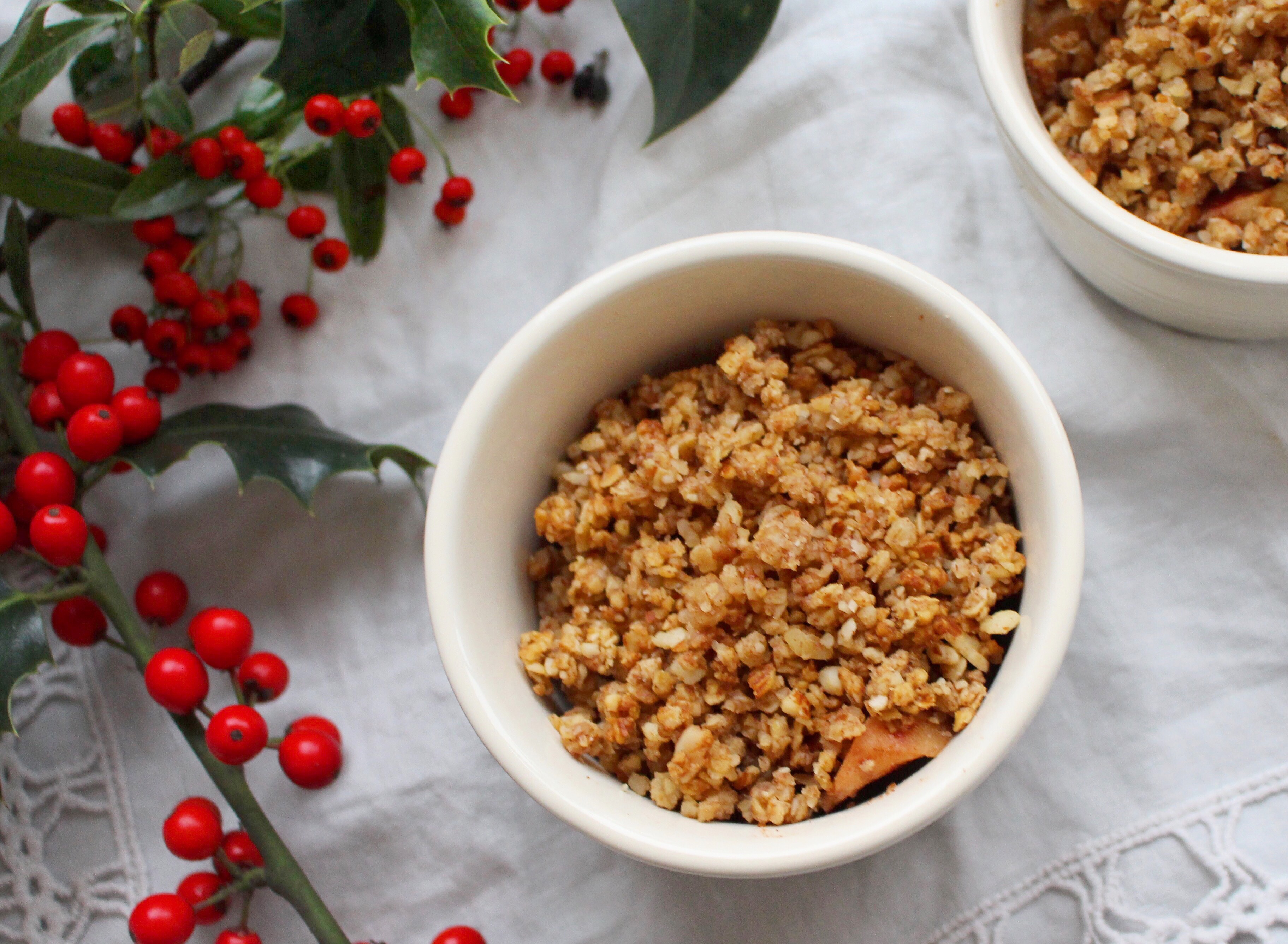 This recipe came about as I was thinking about how delicious and Christmassy mince pies are, but sadly I can’t eat most shop-bought ones as they tend to be loaded with gluten, dairy and sugar. I wanted to make my own healthy mince pies for a dinner party I was hosting the other day, but was really pushed for time. So I decided to scrap the idea of the pastry (as that’s the time consuming part) and go with a mince pie crumble instead. It literally took me all of about 15 minutes to prepare, and then you just need to pop it in the oven to let it do it’s thang.