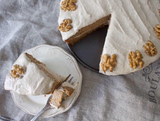 To make the cake, pop the pecans in a food processor and whizz for around a minute until they form a flour. Then pour into a bowl and mix with the ground almonds, buckwheat flour and cinnamon. Combine the grated carrot, banana, yogurt and maple syrup in the food processor and whizz until a thick, creamy mixture forms. Add this mixture into the bowl with the other ingredients and mix until a lovely batter forms. I prefer my carrot cake without any raisins or sultanas in, but if you want to add them in, now’s the time to stir them into the batter.