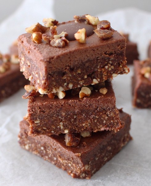 For the frosting, melt the cacao butter in a bowl over a saucepan of boiling water (or in the microwave) and then once melted, stir in the other ingredients and mix well. Spread this on top of the brownies and use a spoon again to make sure they’re all evenly covered. Decorate with a couple of chopped pecans and some chocolate buttons if you fancy, then cut into squares and pop in the fridge for an hour or so to allow the frosting to set.