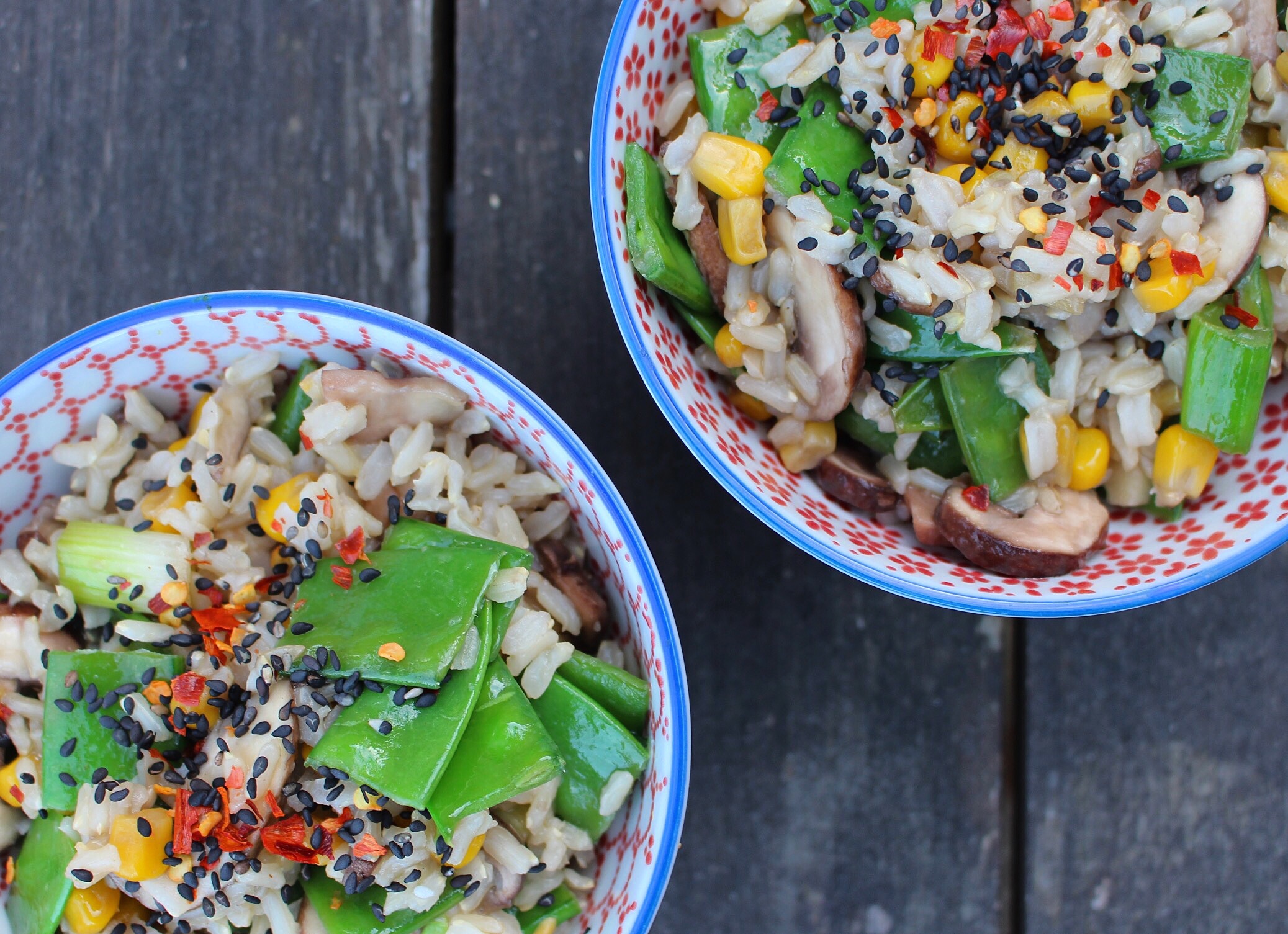 Next, finely chop the garlic clove and fresh ginger and combine in a small bowl with the tamari and sesame oil. Pour this into a wok and heat on a medium heat for around a minute, then add in the spring onions, mushrooms, mange tout and sweetcorn. Stir fry on a medium heat for about five minutes (until the veggies start to soften) then stir in the rice. If you’re using eggs, now’s the time to push everything to one side of the wok and crack the eggs into the empty side, then keep stirring them as if you’re making scrambled eggs until they are cooked and finally stir them into the rest of the dish.