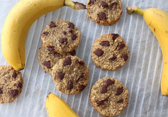 Simply mash the bananas in a bowl, then add in the oats and maple syrup and stir together well. Break the chocolate into chunks and stir this through the mixture, then form into balls and flatten into round cookies.