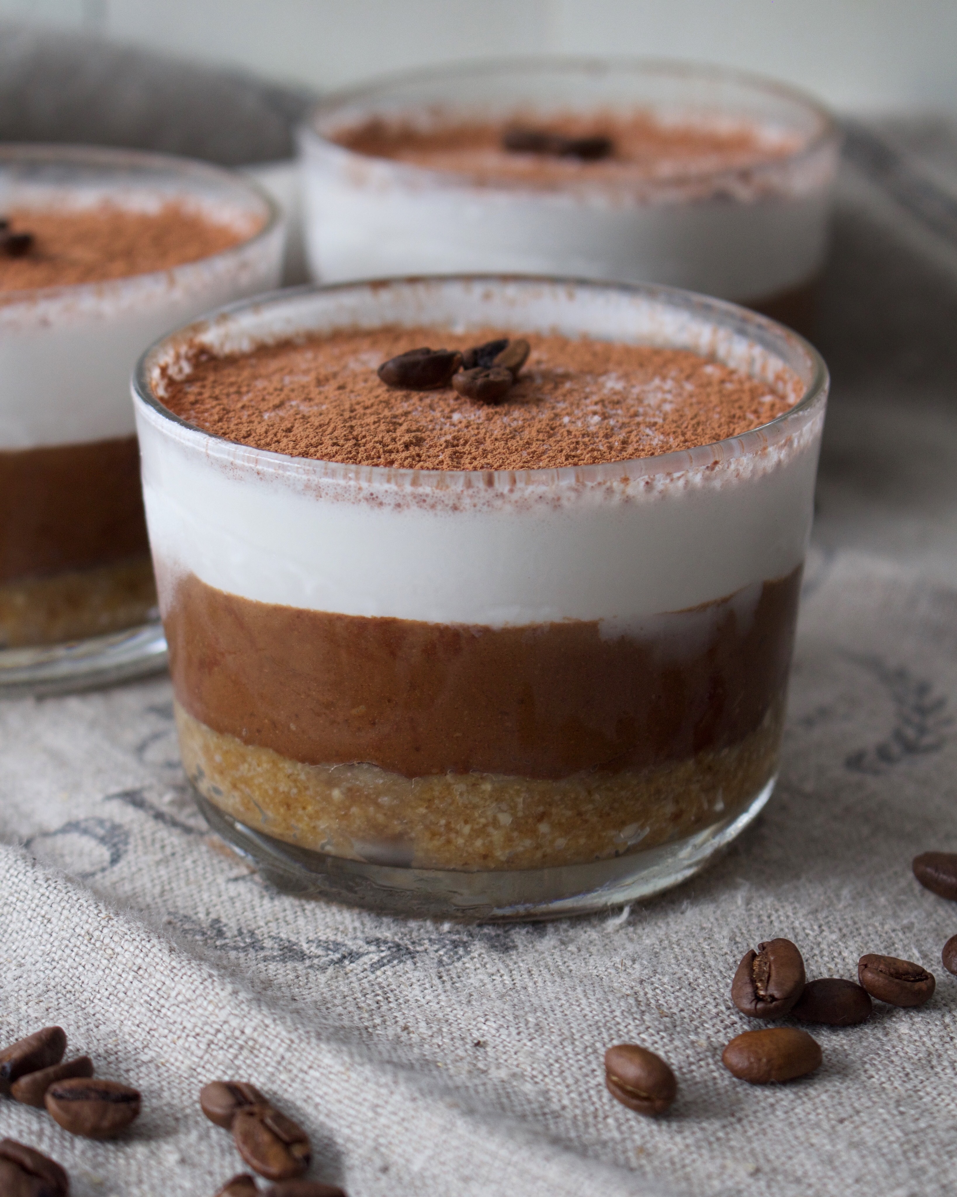 For the coffee cream layer, simply add all the ingredients to a mixing bowl and stir well. Spoon this on top of the chocolate mousse layer and top with a dusting of cacao powder.