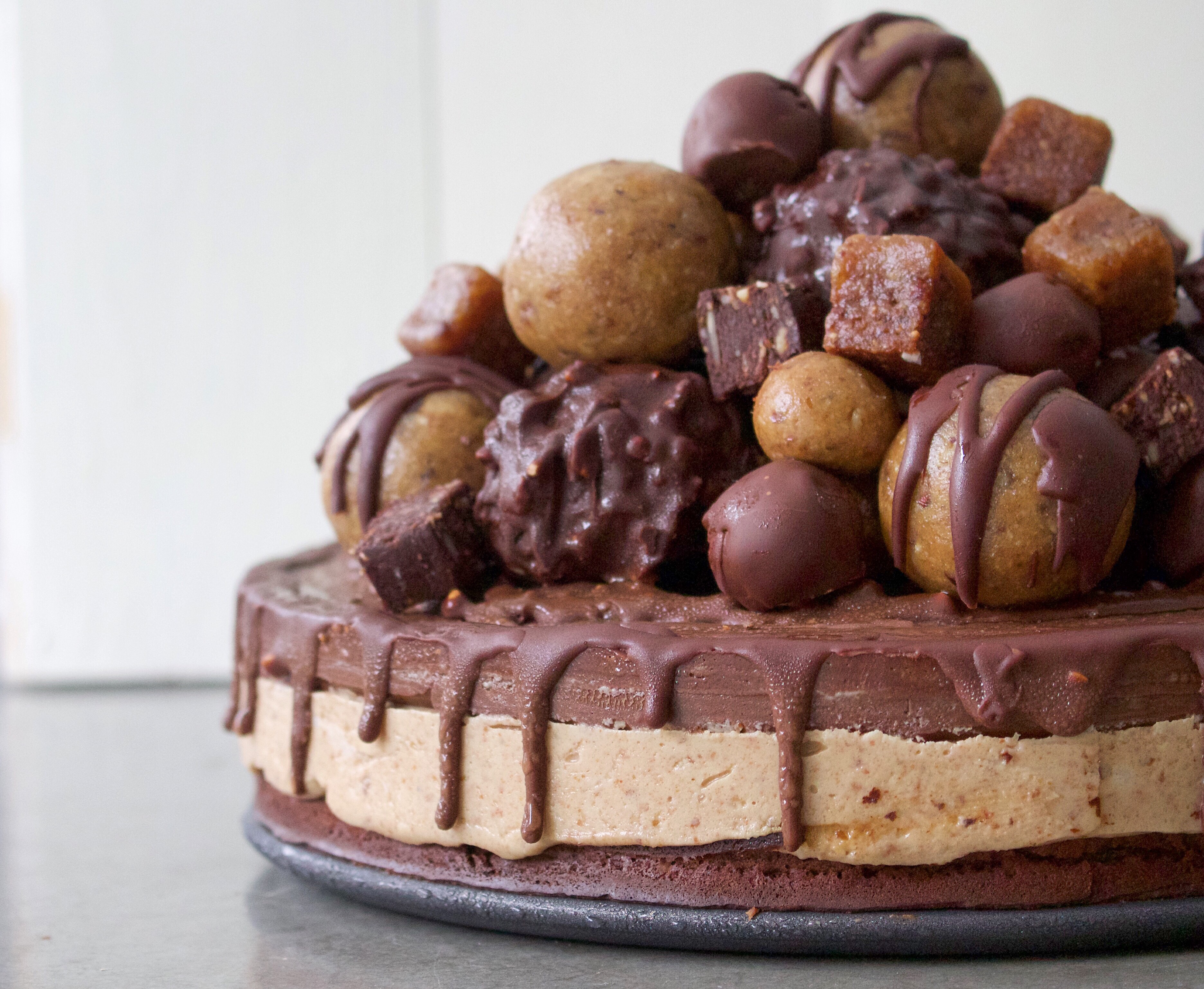 So there you have it – the worlds best birthday cake (in my opinion) and it’s all totally guilt free! If you fancy going all out with your toppings too, I topped mine with some raw chocolate (just melt 1/2 cup cacao butter then stir in 4 tbsp cacao powder and 4 tbsp maple syrup) as well as some of my Ferrero Rocher, cookie dough balls, almond butter slices (without the chocolate on top) and raw triple chocolate brownies! I’ll warn you though this cake was pretty hard to cut with all those toppings loaded on, but then it was incredibly easy to eat!
