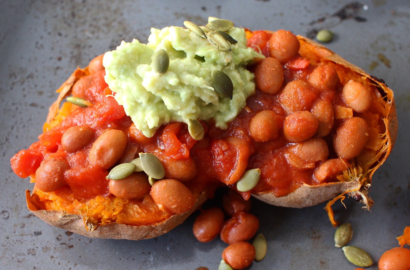 Recently I’ve gotten really into meal prepping on the weekend, so I’ll make a big batch of these beans and freeze them so that when it comes to the weekdays all I have to do is bung some sweet potatoes in the oven, defrost the beans, heat them up and stick them on top! I love love love these with a dollop of guacamole or with a side salad and some houmous, but if you do eat dairy you can also add some grated cheese or sour cream too. Either way, it’s such a great meal and so good for you as the beans are packed with protein and the sweet potatoes are great for energy but also a great source of vitamins, minerals and fibre!