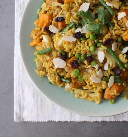 While the veggies are roasting, wash the rice in cold water, then set aside. Heat 1 tbsp of olive oil in a saucepan and sauté the onion with the garlic, bay leaf and other spices on a low heat for about 10 minutes. Stir in the rice, then pour over the stock, cover the pan with a lid and bring to the boil. Once it’s boiled, bring down to a medium heat and cook for 15 minutes (or until the rice is al dente), then add in the green beans, peas, cauliflower and sweet potato. Continue cooking on a medium heat for about 5 minutes, until most of the liquid has been soaked up. Remove the saucepan from the heat and leave to stand for 10 minutes or so before adding in any fresh coriander, raisins and cashews and serving up!