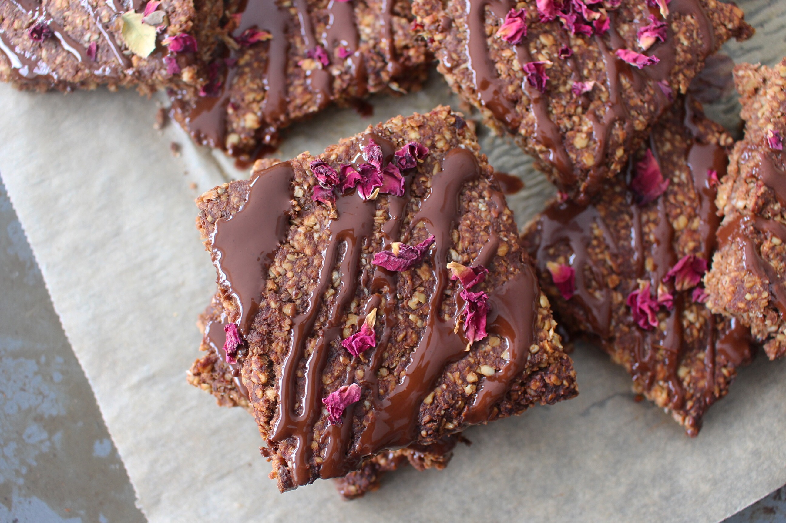 If you want to add the chocolate drizzle on top, once the flapjacks have cooled (this will feel painfully slow I’m warning you) melt the cacao butter in a pan on a low heat, then add then cacao powder and maple syrup and stir until you have a lovely melted chocolate mixture. Drizzle over the flapjacks and decorate with seeds on top.