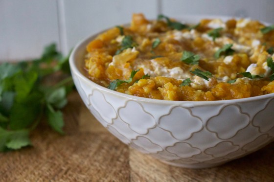 Cook on ‘high’ for 4 hours, then mash well (the veggies should be super soft so this should be really easy) and stir in the coconut milk. Leave to cook for another 10 minutes then serve in a bowl with some fresh coriander on top and a side of brown rice or quinoa – a winter warmer at its best!