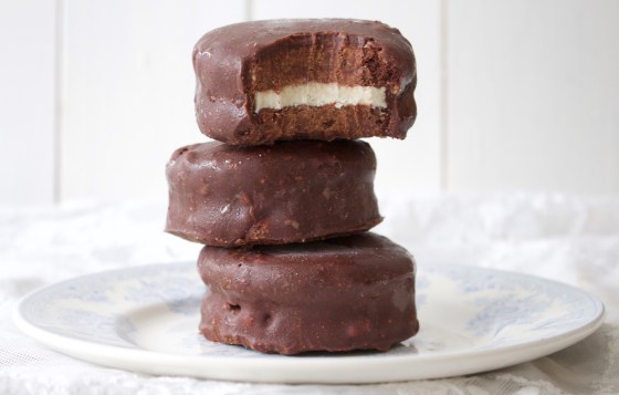 For the filling, add the ingredients to a food processor and whizz until they form a smooth creamy mixture. It may seem quite liquidy but don’t worry – it will set in the fridge! Place it in the fridge for half an hour, then when it has set (and the biscuits have cooled) spoon it onto half the cookies and squish down the other halves on top to make delicious sandwiches. Place these in the freezer for an hour while you make the chocolate.