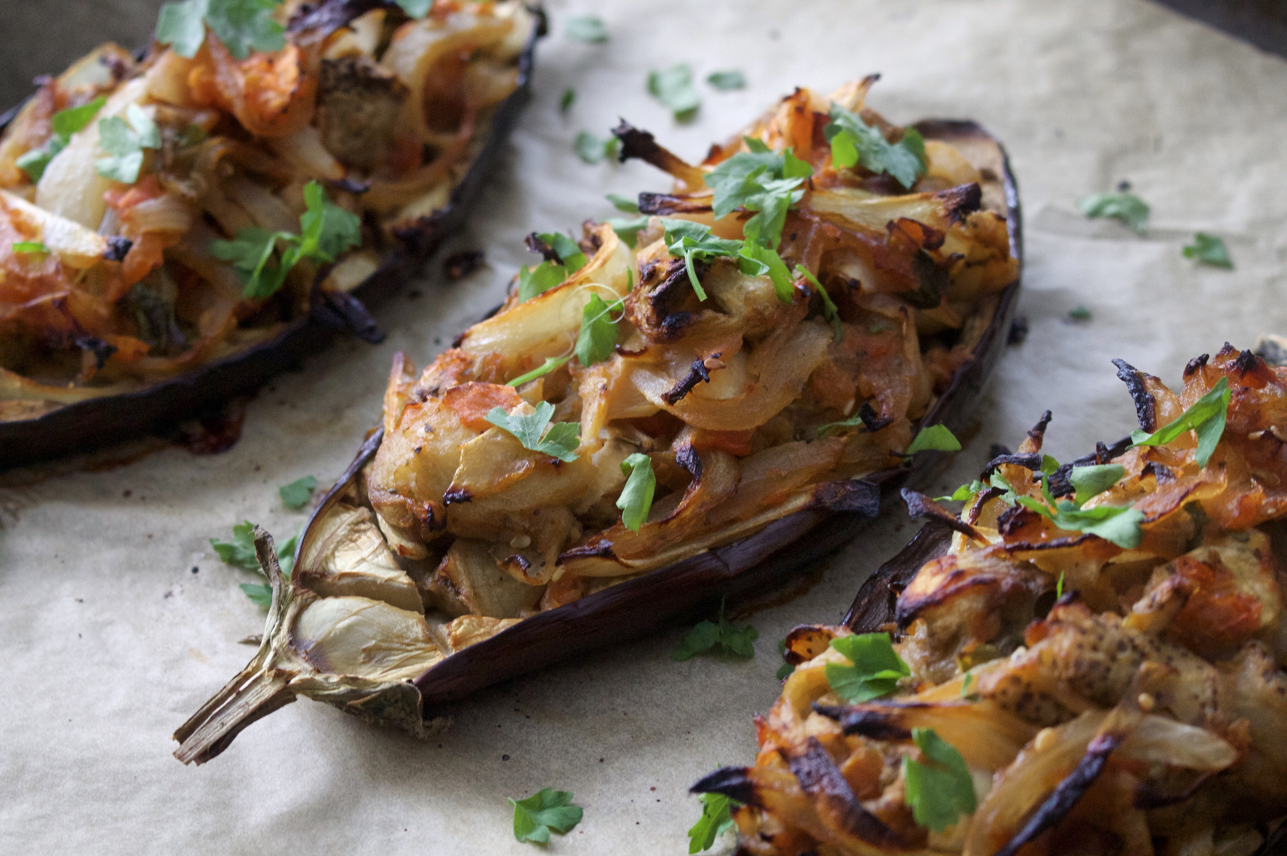 We used to go to a certain little Turkish place that my grandpa liked when he was alive, it was nothing fancy, but had a lovely atmosphere and delicious food. I’m pretty boring when it comes to menus; when I find something I like I’ll stick to it, and such is the case with stuffed aubergines (or imam bayildi). I’m obsessed with aubergine, and stuffed with onions, garlic and tomatoes these beauties are a serious contender for what I might choose as my death row meal.These make a seriously scrumptious dinner, I love to have them as a main with some brown rice and greens, but you could make them as a starter or side dish too – they’re a great dinner party staple!