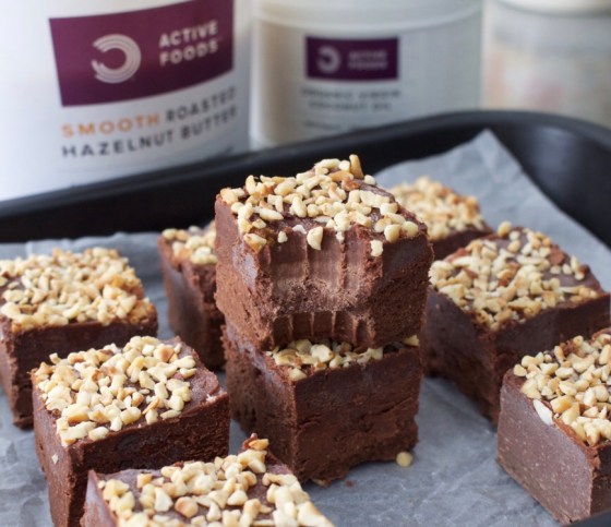 Melt the coconut oil by placing it in a bowl over a saucepan half full of water on a medium heat on the hob until it melts (if you stir while melting it it will be quicker) then pour the oil into a bowl and add in the other ingredients. Stir well until you have a thick chocolatey mixture (try not to eat it all already!) then pour this into a baking tray or mould (I used an 8″ loaf mould lined with baking paper for quite thick slices but you can use a bigger tray if you want thinner ones. Sprinkle with chopped hazelnuts if you like, then pop the fudge in the freezer for about four hours to set. Cut into squares and enjoy!