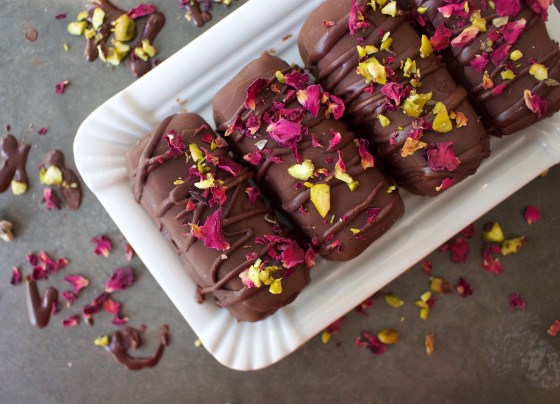 For the chocolate, melt the coconut oil in a bowl over a saucepan half full with water on a medium heat, then add to a mixing bowl and stir in the other ingredients. Allow the chocolate to cool for five minutes or so, as if it’s too hot the ice creams may start to melt when you dunk them in. Place each ice cream in the chocolate quickly one by one and continue doing this until the chocolate is used up. Place the ice creams back in the freezer and serve from frozen.