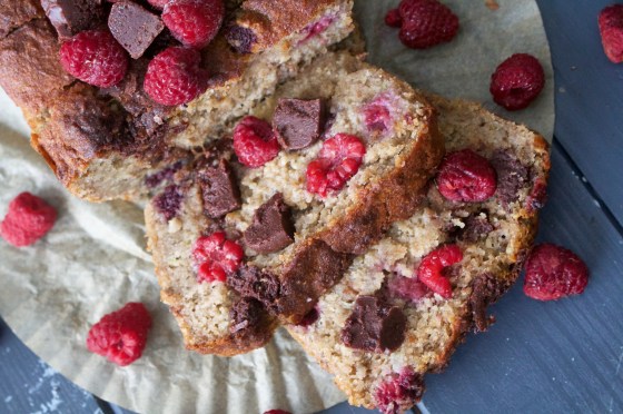 Preheat your oven to 180C. In a large bowl, combine the buckwheat flour, ground almonds and cinnamon and stir, then add in the banana, maple syrup, coconut oil, chia eggs and almond milk and stir well. Lastly stir in the raspberries and chocolate chunks, then spoon the mixture into a lined or greased loaf tin and bake for 30 minutes or until golden on top and a skewer inserted comes out clean. Leave to cool a little before cutting into slices and digging in! Store in an airtight container in the fridge for upto five days, or freeze for upto two months.
