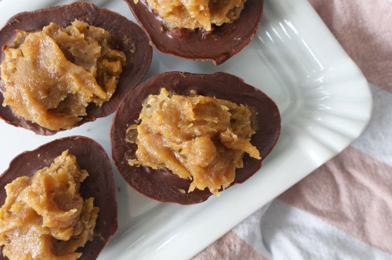 For the filling, combine the ingredients (except the peanuts) in a blender and whizz until you have a smooth stick caramel. Add in the peanuts and whizz for another 30 seconds or so to blitz them up a bit. Spoon the filling into the middle of the moulds, leaving around 1/2 a centimetre around the edges for the chocolate. Pour the rest of the chocolate in round the edges and place back in the fridge for 15 minutes to set.