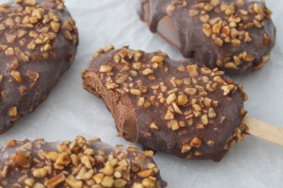 Melt the coconut oil in a saucepan then stir in the other ingredients. Remove the lollies from their moulds and dunk into the chocolate one by one. Store in the freezer, or eat them as soon as the chocolate sets!