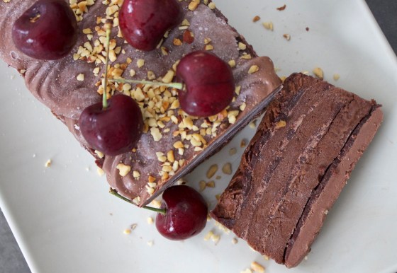 Add the chocolate ingredients to a bowl and mix well. In a loaf tin (I use a silicone one but if not then just line it with paper so you can get it out) start with a thin layer of ice cream and smooth it out so it covers the base evenly, about 1cm thick. Then pour a thin layer of chocolate on top so that it just covers the ice cream. It should set quickly due to the ice cream being cold, so after it has repeat the process again and continue around 4-5 times until you have used both all up. If you like you can use a piping bag to pipe any extra ice cream on top in a pattern and top with chopped toasted hazelnuts or grated raw chocolate. Store in the freezer and remove about half an hour before serving.