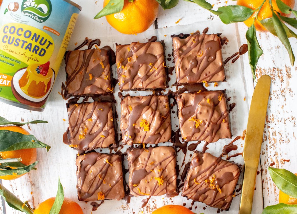 I made this recipe in collaboration with my friends at Nature’s Charm; their products are all vegan but made with coconut instead of dairy. They do the most insane dessert sauces, whipping cream, condensed milk and custard, and for this recipe their coconut custard is the star ingredient. I’ve used it in the brownies for all the fudginess and in my three ingredient frosting as well.