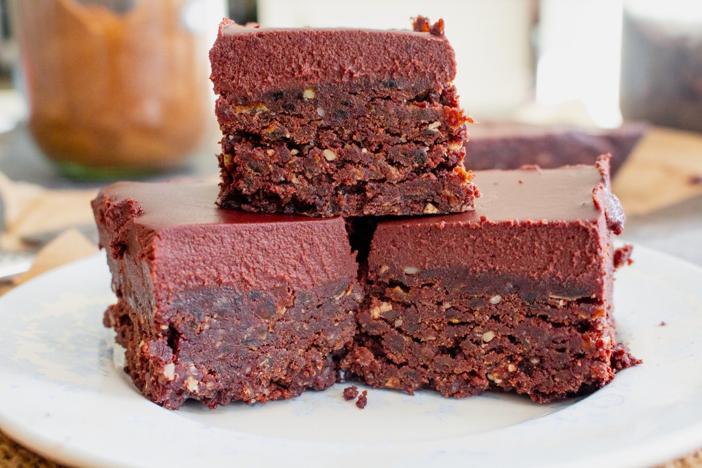 For the frosting, melt the coconut oil in a saucepan on a very low heat, then in a bowl combine it with the other ingredients and gently stir until you have a smooth mixture. Pour this onto the brownie layer and place the loaf tin in the freezer for four hours to set. Once it has hardened on top, slice the brownies into squares and store in an airtight container in the fridge for upto a week. They also freeze really well too!