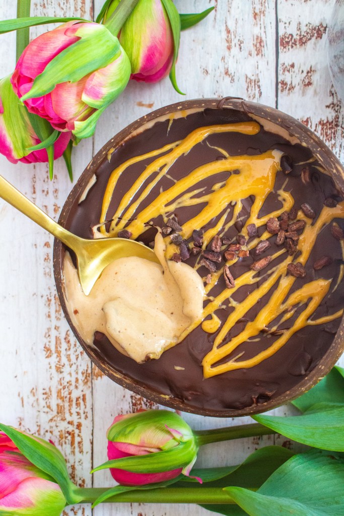 Melt your chocolate in a bowl over a saucepan with two inches of water on a low heat. Pour the smoothie into a bowl, and spoon the chocolate on top to form a shell. Pop any extra peanut butter and cacao nibs on top then grab a spoon and tap tap tap away into the most indulgent and delicious bowl ever!