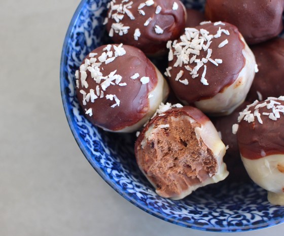 For the dark and white chocolate coatings, melt the cacao butter for each in a bowl over a saucepan of boiling water, then stir in the other ingredients. Remove the truffles from the freezer and dip them in the melted white and dark chocolate – the more times the better! Pop them in the fridge for ten minutes to set then enjoy!