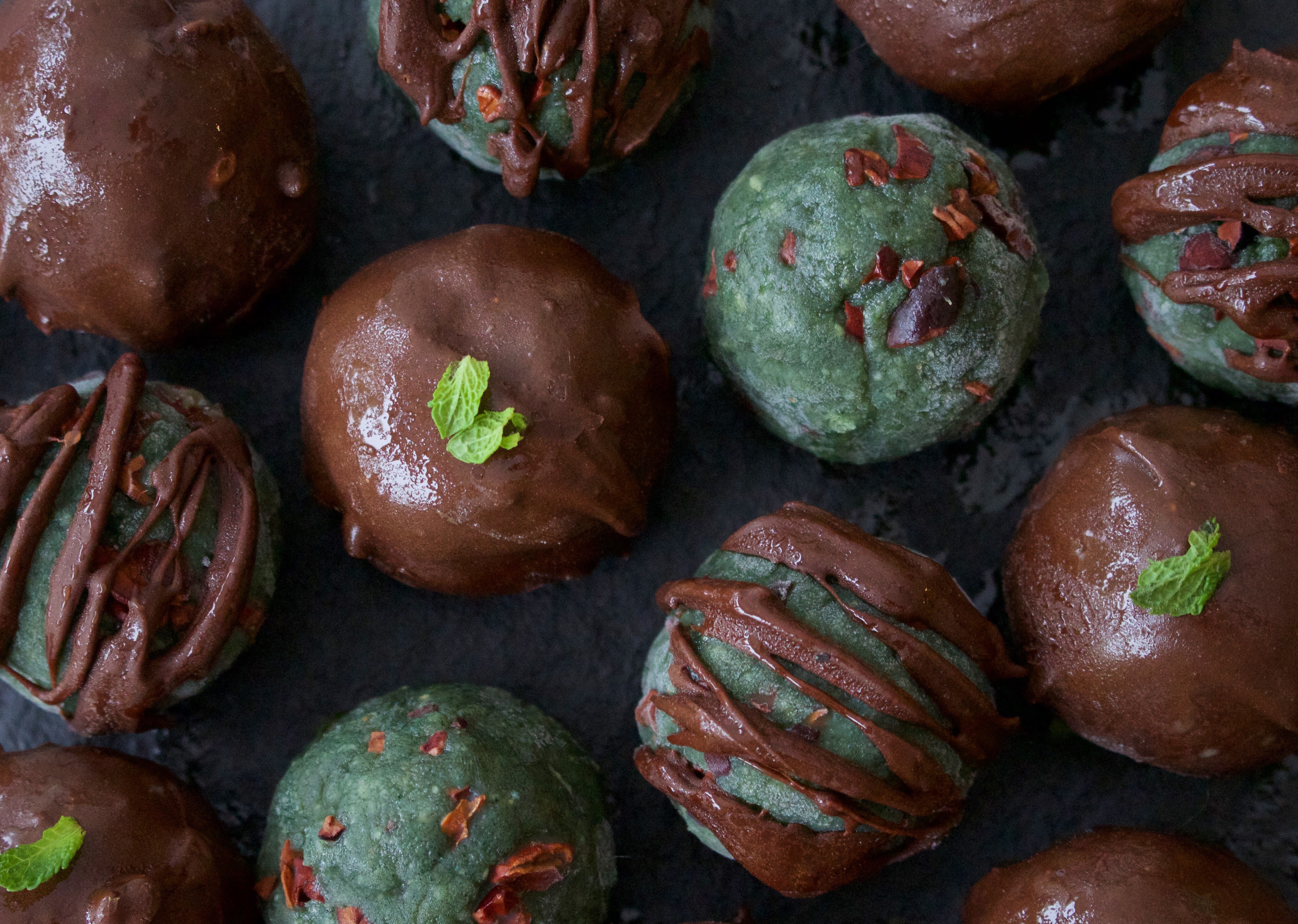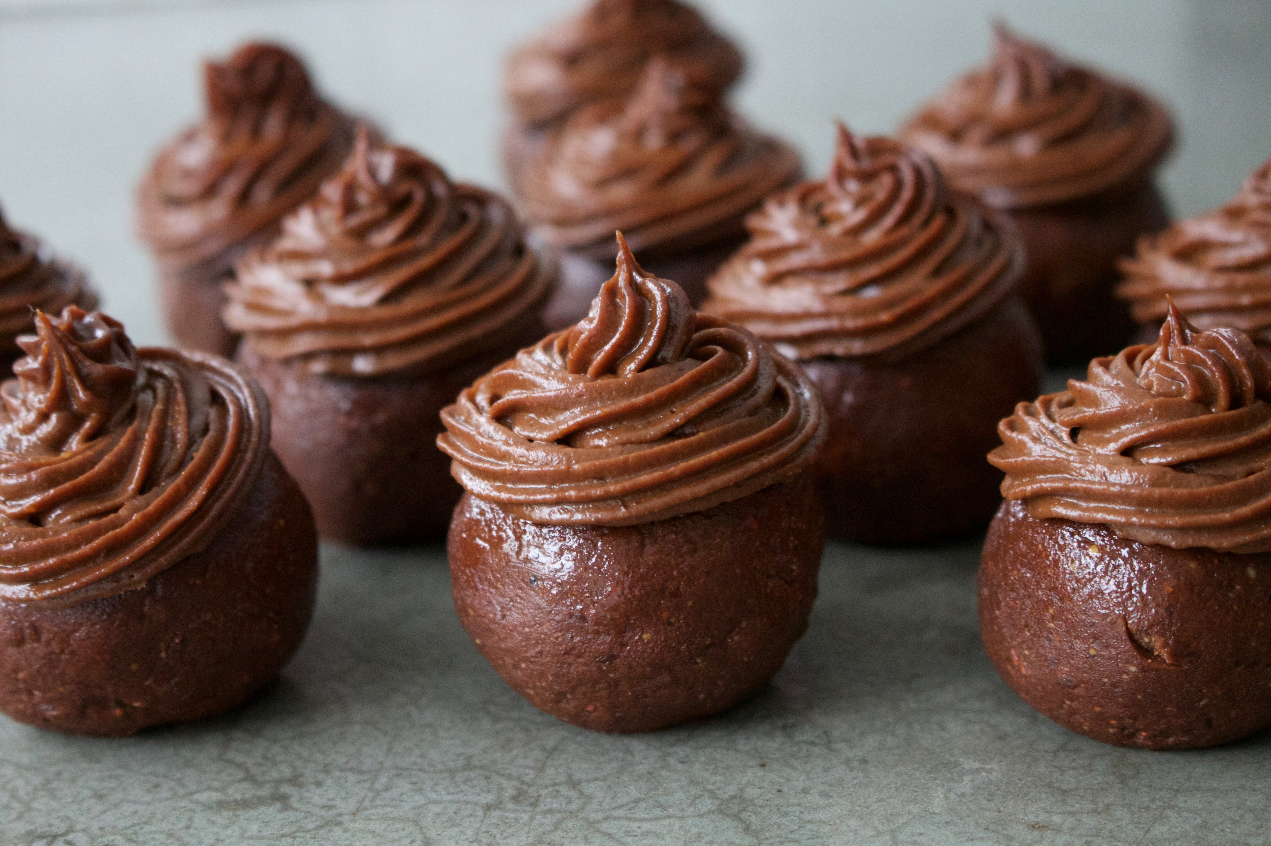 For the frosting, scoop the insides out the avocado and combine these with the other ingredients in a food processor. Blend for around five minutes until a super smooth and silky mixture forms. Remove the balls from the freezer and either use a teaspoon to spoon the frosting on top or get your piping bag and nozzle out!