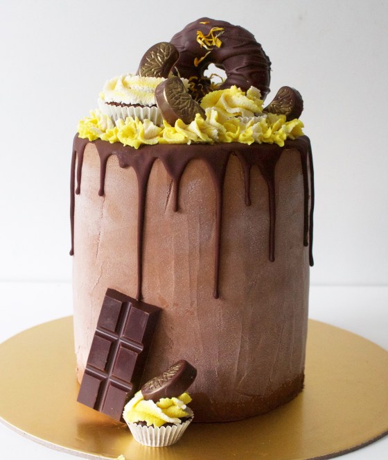 Indulgent chocolate fudge layer cake with a rich chocolate orange ganache filling & frosting.
