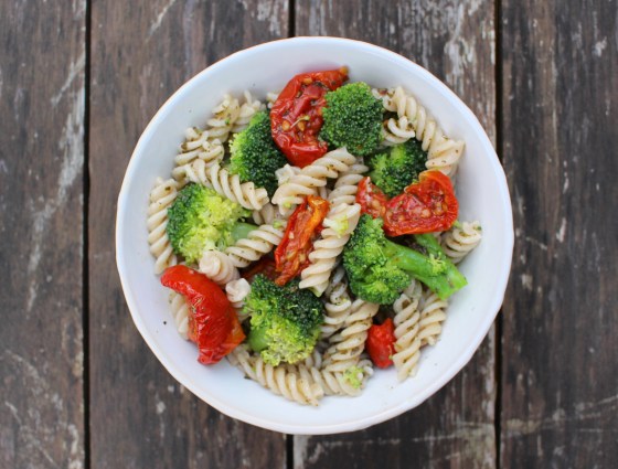 Super simple pesto pasta with sun-dried tomatoes and broccoli